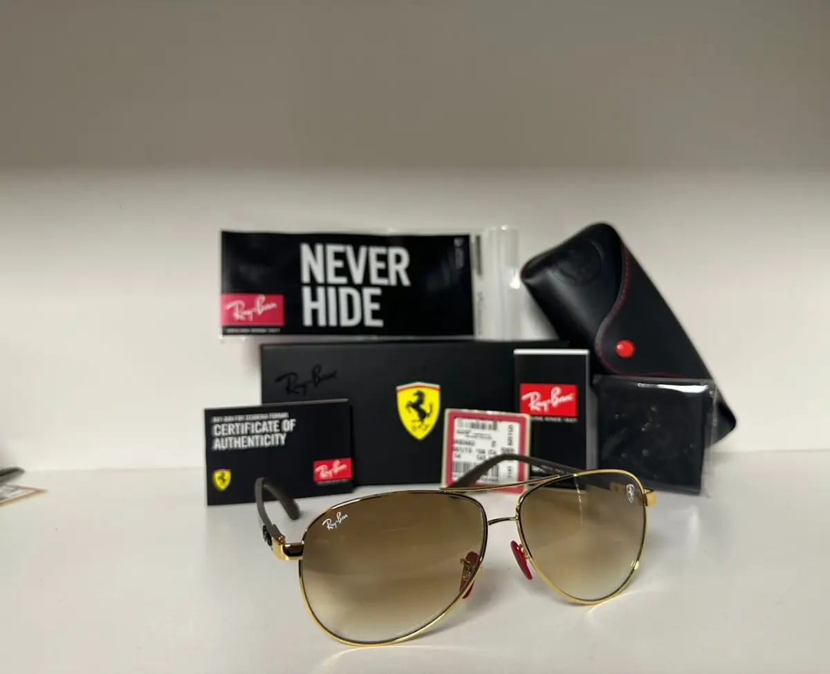 Incluye estuche Ferrari edición especial, paño, certificado de autenticidad y packaging original Ray-Ban.