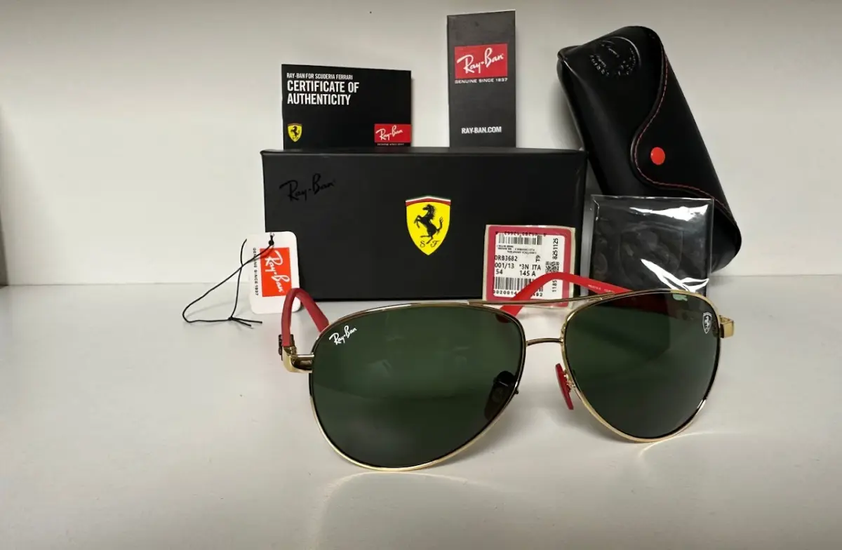Incluye detalles exclusivos de la colección Ferrari: escudo en la lente, plaquetas rojas y estuche original con costuras rojas.