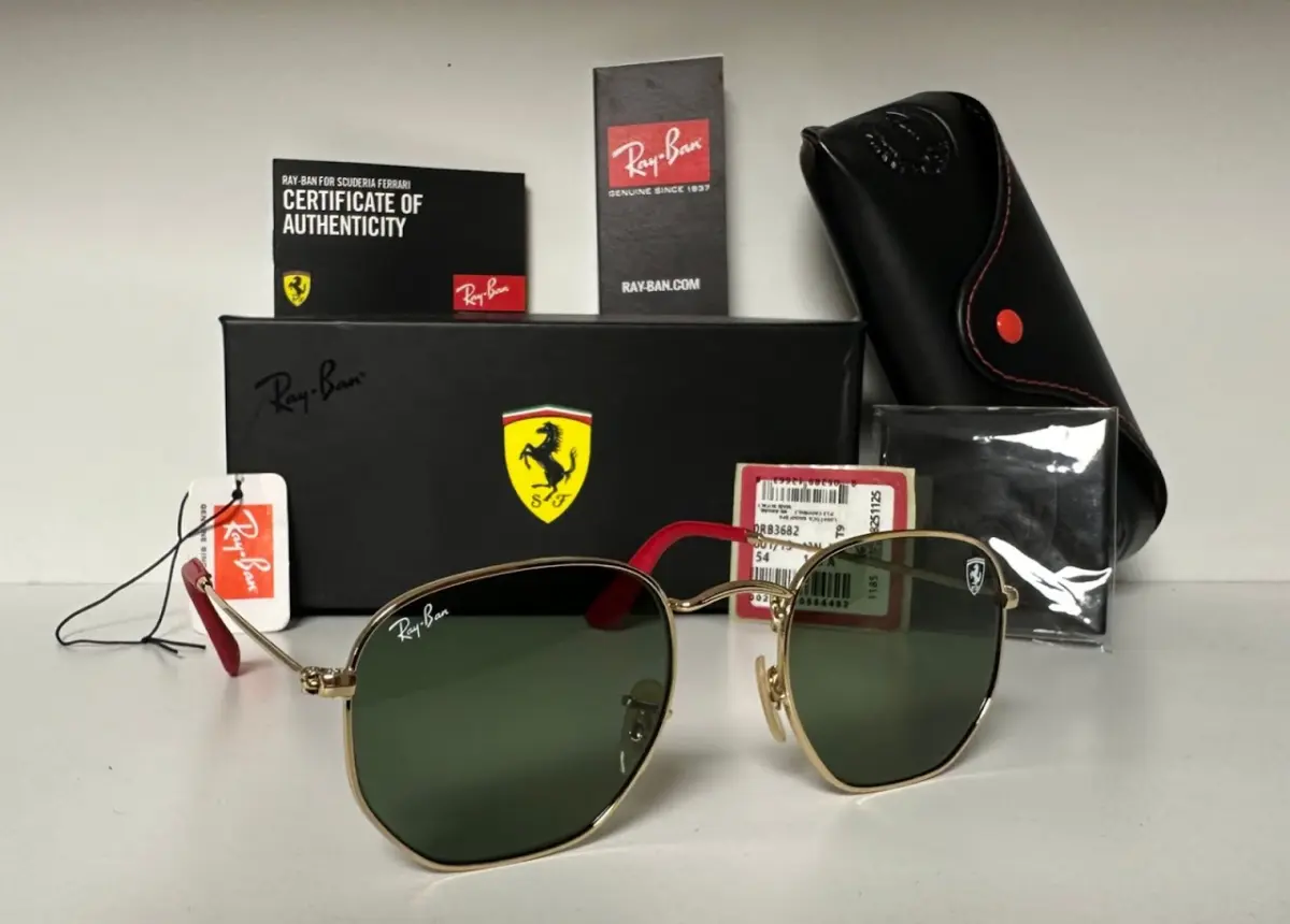Estas Ray-Ban Scuderia Ferrari 3548-M F001 combinan sofisticación y deportividad en un diseño hexagonal único. Su armazón metálico dorado se complementa con lentes verdes de alta nitidez, creando un estilo moderno, ligero y resistente.