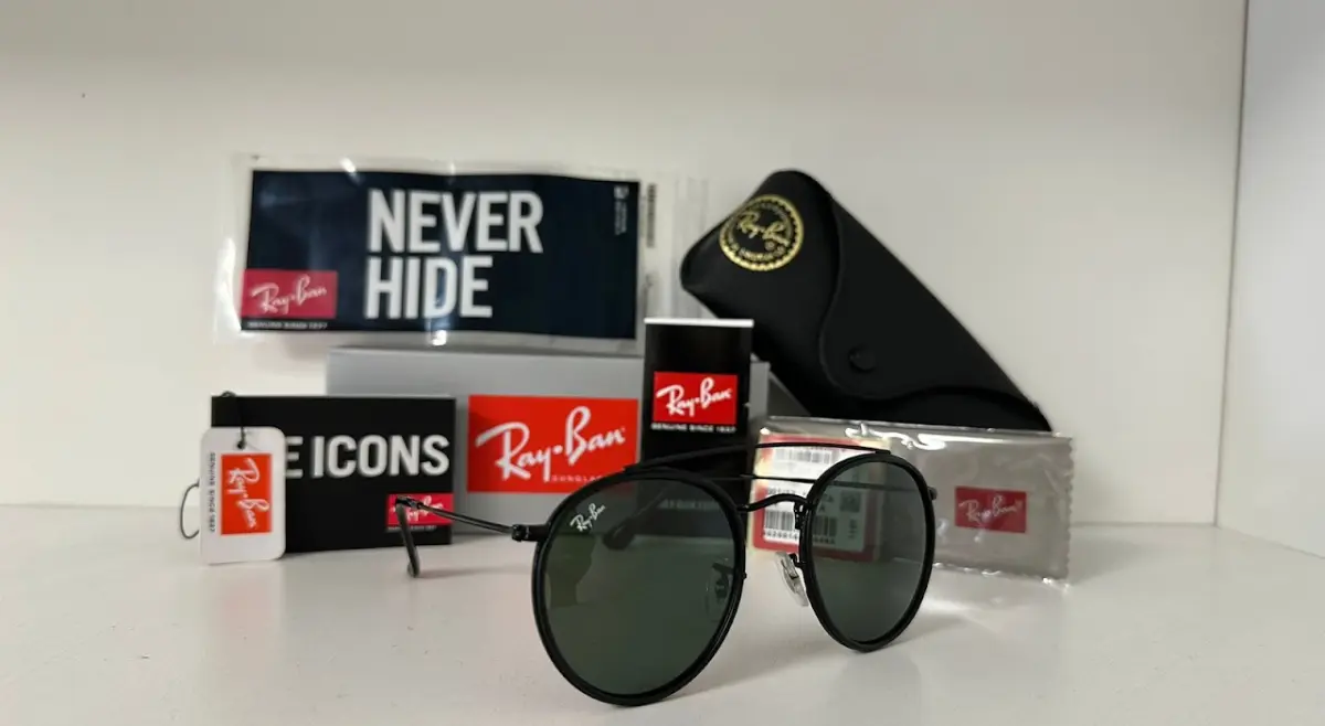 El producto incluye todos los accesorios originales: estuche rígido Ray-Ban, paño de limpieza, etiquetas, folleto “The Icons” y material promocional “Never Hide”. Su construcción ligera y los apoyos nasales ajustables aseguran confort durante todo el día.